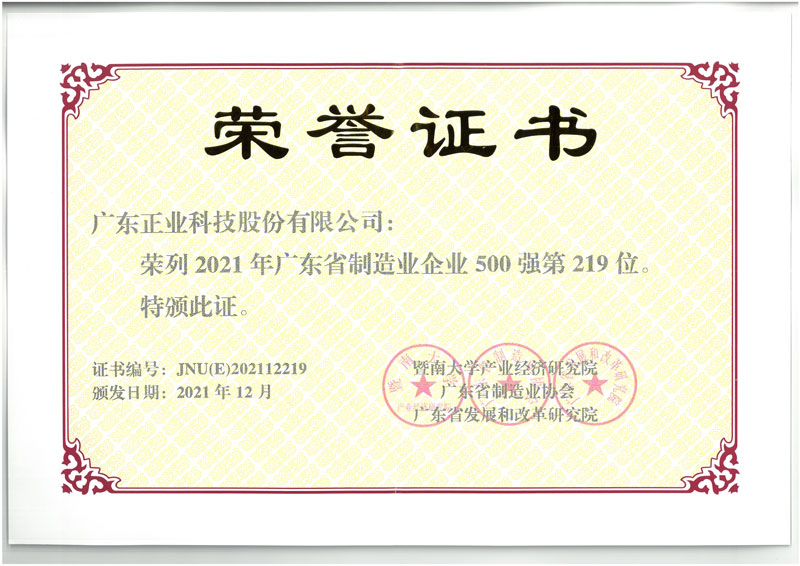 會上,主辦方發(fā)布了“2021廣東省制造業(yè)500強(qiáng)企業(yè)”名單。正業(yè)科技憑借卓越的技術(shù)能力、過硬的綜合實(shí)力,與華為、正威、富士康、美的等知名企業(yè)一同入選,榮列廣東省制造業(yè)企業(yè)500強(qiáng)第219位。