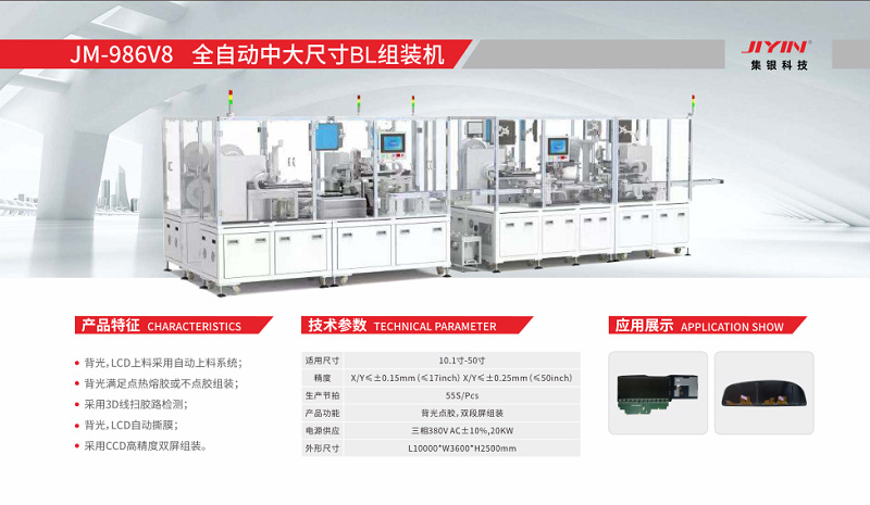 本次展會,集銀科技帶來了一系列平板顯示智能裝備解決方案亮相,包括:全自動小尺寸COF/COG綁定線、全自動中大尺寸COG綁定線、全自動小尺寸真空貼合線、全自動小尺寸OLED曲面貼合線、全自動背光組裝線、全自動背光源組裝線、非標自動化生產組裝線。每一個智能裝備解決方案都配有專屬的展示大屏,從業者們紛紛駐足觀看,并與現場工作人員密切交流。