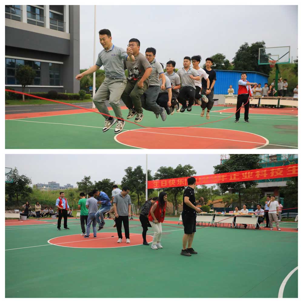 生日活動共有3個游戲項目:跳繩比賽、二人三足比賽、蒙眼吃西瓜,各隊伍分組角逐,奮勇爭先,積極參與到每一個游戲中。場下的隊友鼓舞吶喊,加油助威,現(xiàn)場氣氛活躍,展示了正業(yè)員工團結(jié)協(xié)作,友好和諧的團隊精神,整個游戲環(huán)節(jié)趣味橫生,氣氛熱烈,呈現(xiàn)了一場充滿歡聲笑語的歡樂盛宴。