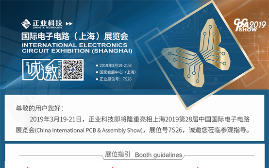 2019年3月19-21日,正業科技即將隆重亮相上海2019第28屆中國國際電子電路展覽會(China International PCB & Assembly Show),展位號7S26,誠邀您蒞臨參觀指導。